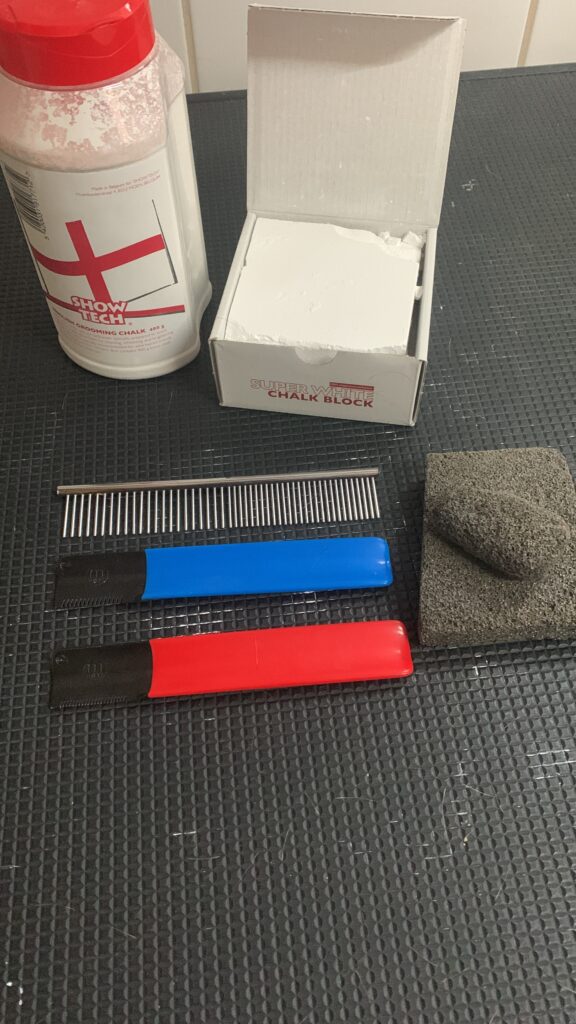 Je nach Fellpartie verwende ich verschiedene Trimmesser. Mit der Zeit habe ich gelernt, welches Messer sich für welchen Bereich am besten eignet. Ich setze aber auch Fingerlinge, Trimmpuder und Trimmstein ein. Die richtigen Utensilien fürs Trimmen machen einen riesigen Unterschied – für das Ergebnis, für Floras Wohlbefinden und auch für mich, weil es einfach ergonomischer in der Handhabung ist.